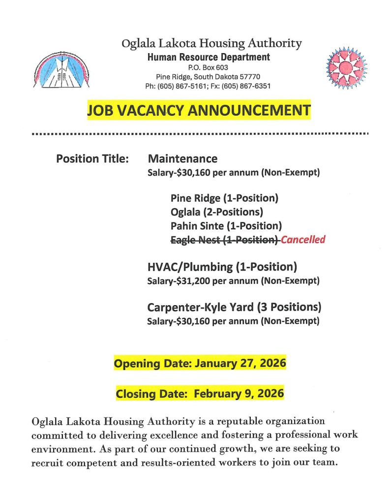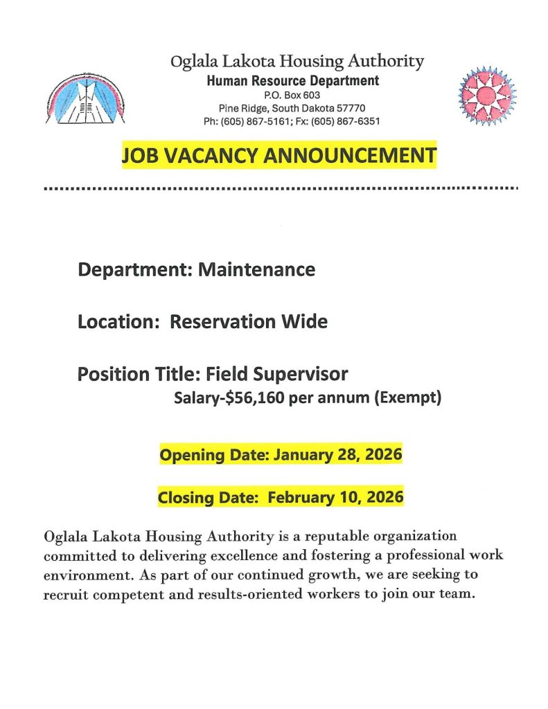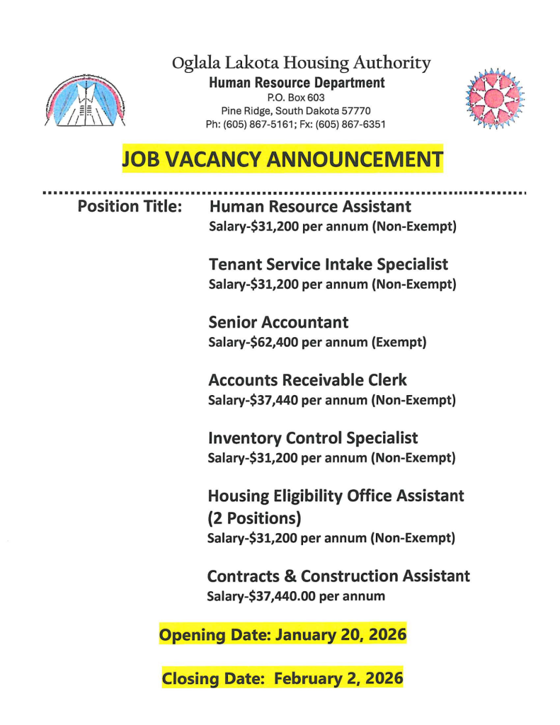 For position description and/or additional information please contact Helene Bagola at the Oglala Lakota Housing Authority Human Resources Office at (605)867-5161 or email at helene.bagola@oslh.org